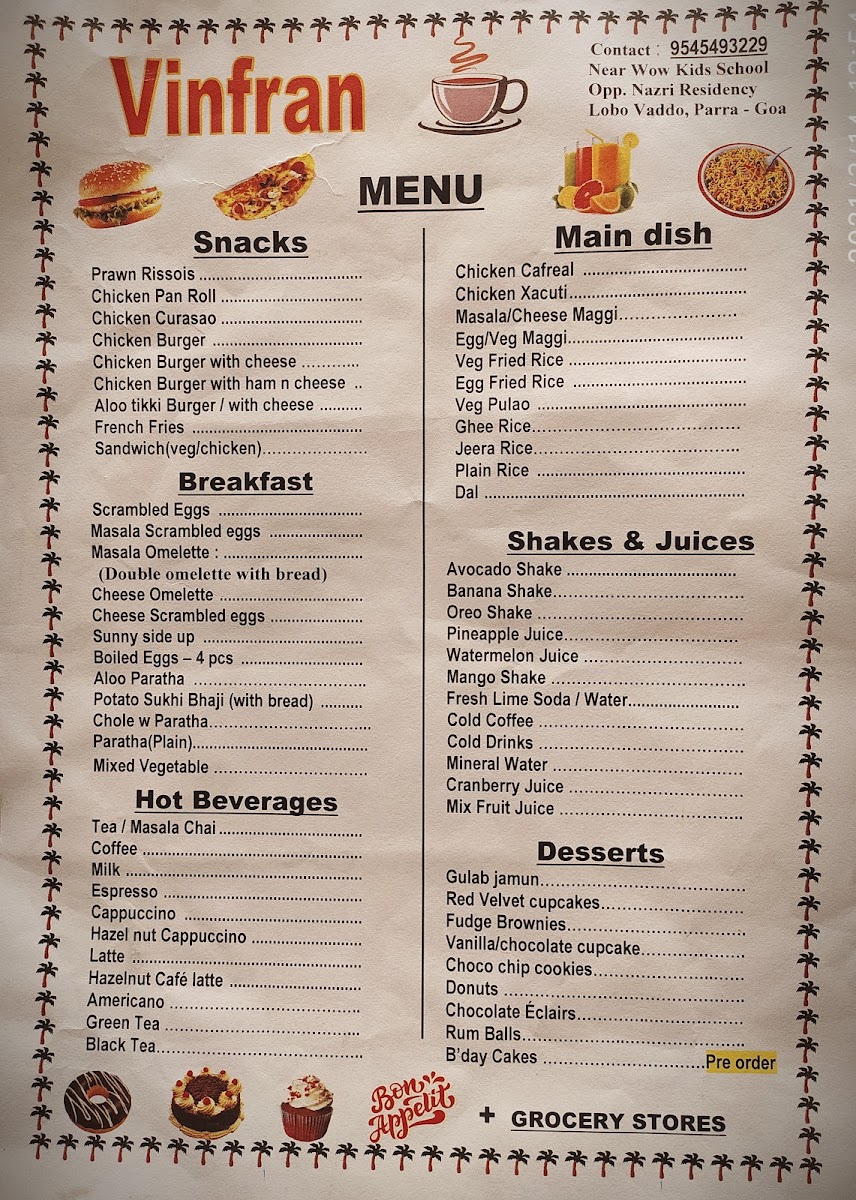 Welcome to Vinfran Cafe, a charming culinary gem nestled in the heart of Parra, Goa. This delightful café is not just about food; it’s about creating a warm atmosphere where every meal feels like a homecoming. Whether you’re here for breakfast, lunch, or a casual snack, Vinfran Cafe is the perfect spot to indulge in delicious offerings while soaking in the friendly vibe of Goa.